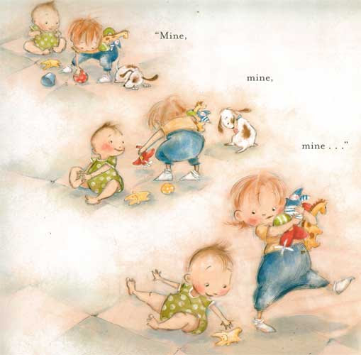 hers......while a giggling, crawling sibling looks on.....and a puppy